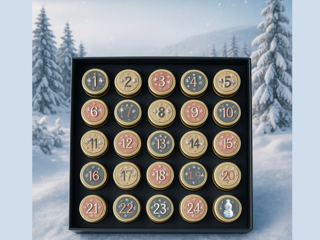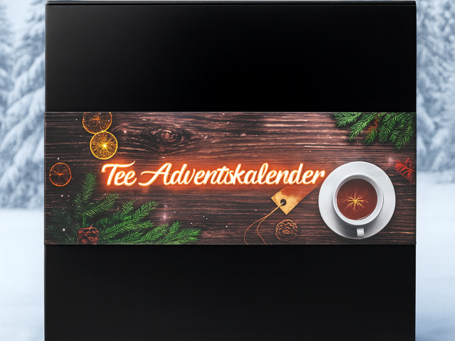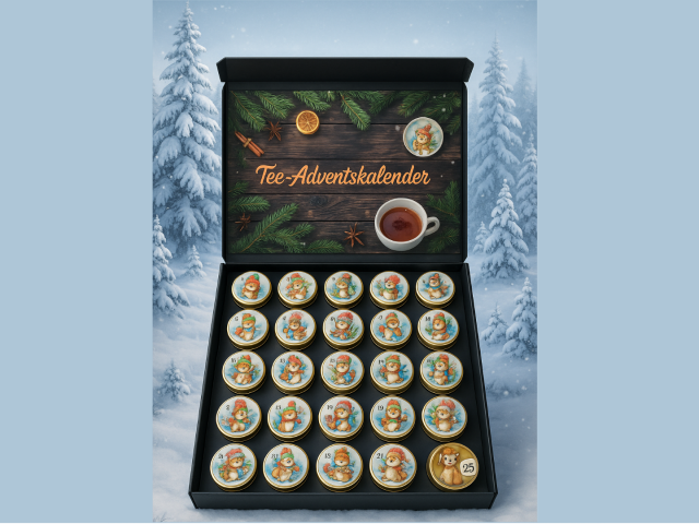 Unser Adventskalender hält 25 kleine verschiedene Tee Köstlichkeiten für Sie bereit. Die Tees sind in kleine Gläschen abgefüllt und ergeben jeden Tage eine Tasse wunderbaren Tee. In dem Kalender sind verschiedene Teesorten wie Grüner, schwarzer, Rotbusch und Früchtetee.