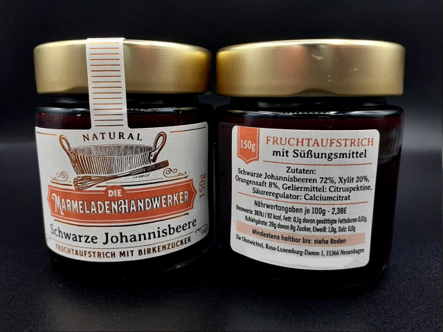 Zutaten: Schwarze Johannisbeeren, Xylit 20%, Orangensaft, Geliermittel: Citruspektine
